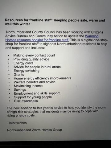 Northumberland County Council has been working with Citizens Advice Bureau and Community Action to update the War ming Homes Resource booklet for frontline staff.